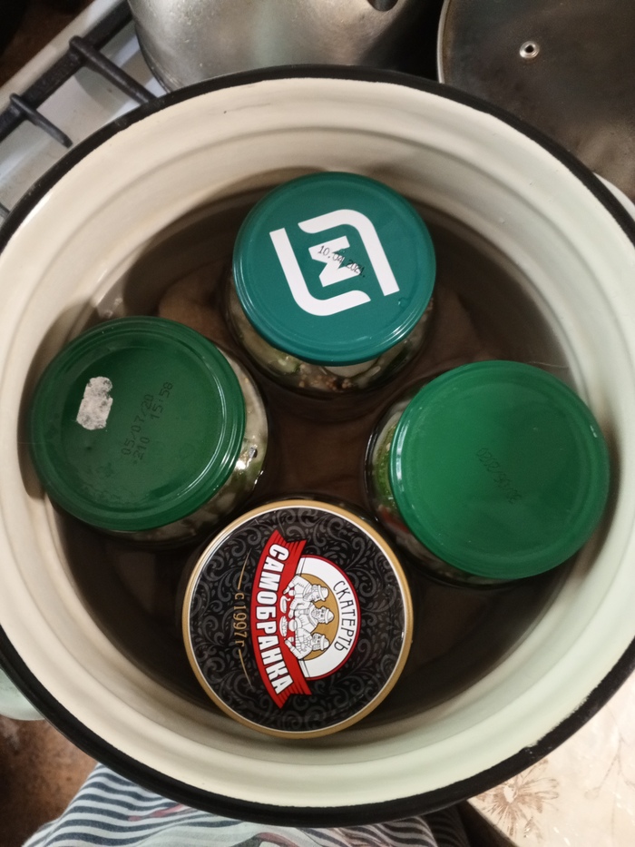 Далее - берём большую кастрюлю, кладём на дно полотенце, помещаем в неё банки, банки накрываем крышками, доводим до кипения и стерилизуем 15 минут.