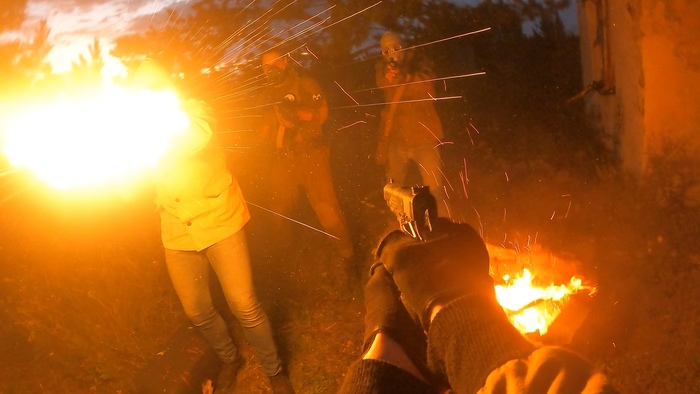 Наступил наконец день съёмок. Взял в аренду самую последнюю GoPro, потому что там лучше стабилизация чем в моей семерке. Намутил пушек, подготовил реквизит. Ну и как обычно, съёмки пошли через жопу. Все участники очень сильно опоздали. И потому сцены которые мы должны были снять накануне вечером – снимали на следующий день. Кое как с трудом удалось снять ночью огненную аномалию. Изначально мы чуть не спалили дом Лесника, потом чуть не спалили друг друга. Ладно, хрен с ним. Зато было забавно. На самом деле всё было достаточно безопасно, но некоторые моменты были для меня немного неожиданными. Всё что снимали утром и в обед на следующий день… По большей части я остался недоволен полученным материалом. После съёмок я был дико злой, и мне казалось, что большинство кадров мы запороли. Если до этого у меня был на руках АКМ, и у меня было время отработать с ним правильный ракурс и положение оружия, то АКСУ я взял в руки впервые, поэтому конечный ракурс, который получился, меня совершенно не устроил. Но потом, когда я просматривал материал дома, оказалось, что вполне есть неплохие кадры, и с этим можно работать и что-то слепить. Монтаж был очень сложный. Видео я разбил на две части. Первую серию я монтировал целый месяц. Очень много элементов интерфейса, много мелких деталей, которые требуется анимировать. Просто голова плыла кругом. А диалог с Лесником, который занимает от силы минуту, я анимировал около 15-ти часов. Естественно здесь сказалось то, что я это делал в новых для себя программах, и первое время достаточно сильно тупил.