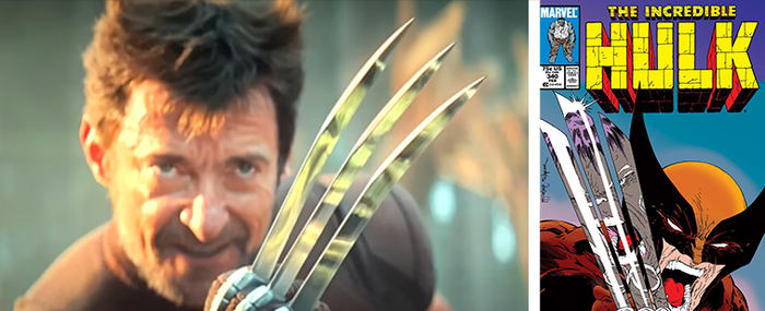 6. Желто коричневый костюм у Росомахи и сцена готовившегося сражения с Халком, тут нас герой немного путает, он говорит что этот Логан придуман Бирном но это не так, кадр где Логан выпускает когти и в них видно отражение Халка отсылает нас к комиксу "Невероятного Халка" № 340 за 1987 год нарисованной Тоддом Макфарлейном а не Бирном. Я еще заметил что в момент когда Уэйд поворачивается к Халку и говорит что он Марвеловский Исус, это отсылка на Локи который встретился с Халком в башне Старка в фильме Мстители 2012 года.