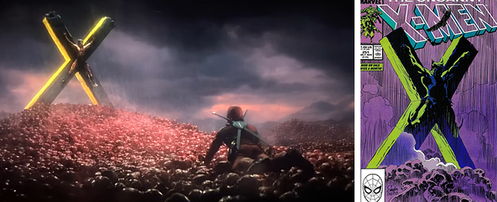 5. В следующей вселенной Уэйд находит Логана прибитого к кресту в окружении черепов. Этот кадр воссоздает обложку Марка Сильвестри к Uncanny X-Men #251 от 1989 года.