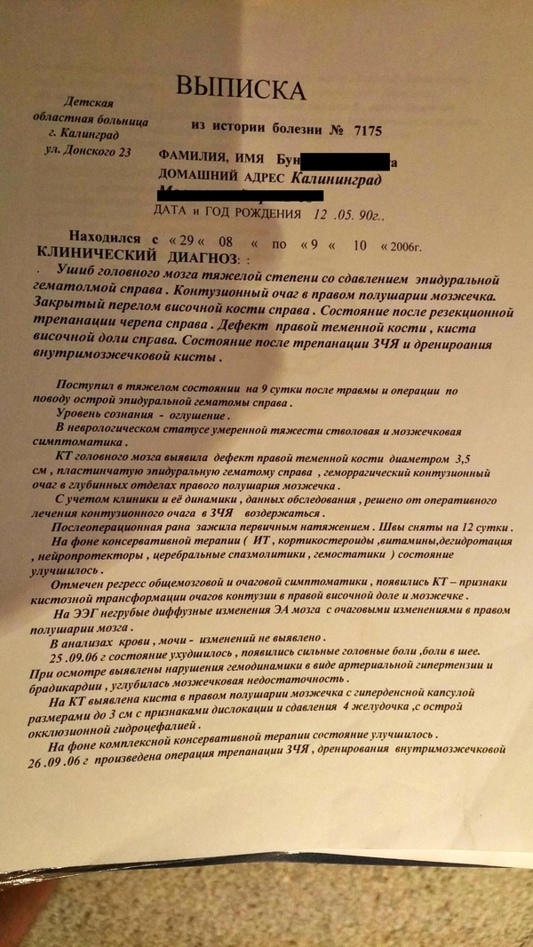 Но конечно есть нюанс. Куда же без него. В один прекрасный день, у меня разошлись швы на затылке. И зашивать обратно мою головушку стали без анестезии. Почему так, не помню. Стоически закусив подушку, я вытерпел и это приключение.