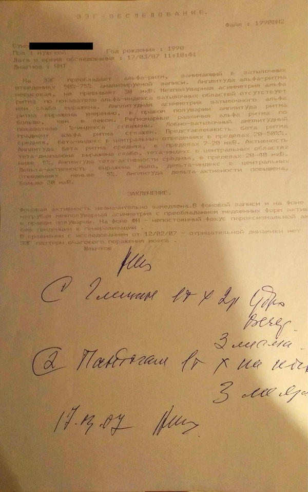 Из интересных мелочей. В один из дней, что ходил на плановый осмотр в десткую областную, после выписки, делали мне электроэнцефалограмму головного мозга. И по ее результатам, разница между полушариями была значительная. Пару лет назад, но по-другим причинам, я опять делал электроэнцефалограмму. По сравнению с левым полушарием разница все еще есть, но менее выражена.
