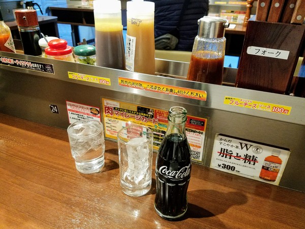 Ассортимент безалкогольных напитков тут небольшой, и кокакола была наименьшим злом. На выбор различные приправы к мясу - чеснок, васаби, соусы.