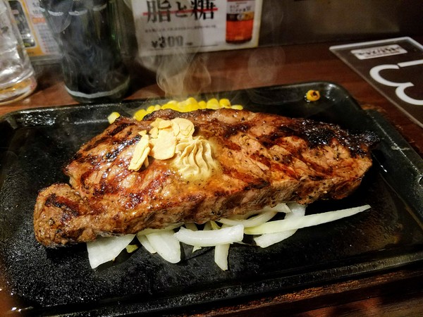 Самый дешёвый стейк тут стоит 5иен за 1 грамм, но это довольно волокнистый чак стейк. Дешевле есть говяжья котлета - 450 иен за 150 гр. Но в обед в рабочие дни есть наборы с котлетами 300гр и стейками 200 гр за 1000 иен.