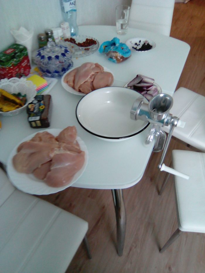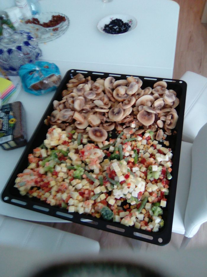 отчет о процессе: купил 15 контейнеров пластиковых, замороженную овощную смесь - 2 пакета, и 2 пакета шампиньонов, куриного филе примерно 2,8 кг, 2 луковицы красных, три зубчика чеснока:
