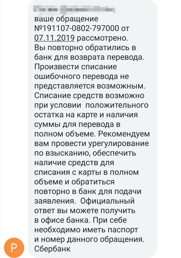 Итак, однажды вечером мне звонит бабушка, она по ошибке перечислила мне на карту по номеру телефона деньги 8800руб, я не против вернуть ей её деньги, но вот беда этот счёт Сбер заблокировал поставив на нём жирный минус (приставы уже третий год пытаются с меня снять деньги, но это уже другая история). Отменить перевод Сбер не желает, мол пока я не закрою минус на своём счёте деньги вернуть нельзя. Я им говорю "ребята у меня есть проблемы со счётом да, но причём здесь эта старушка"?