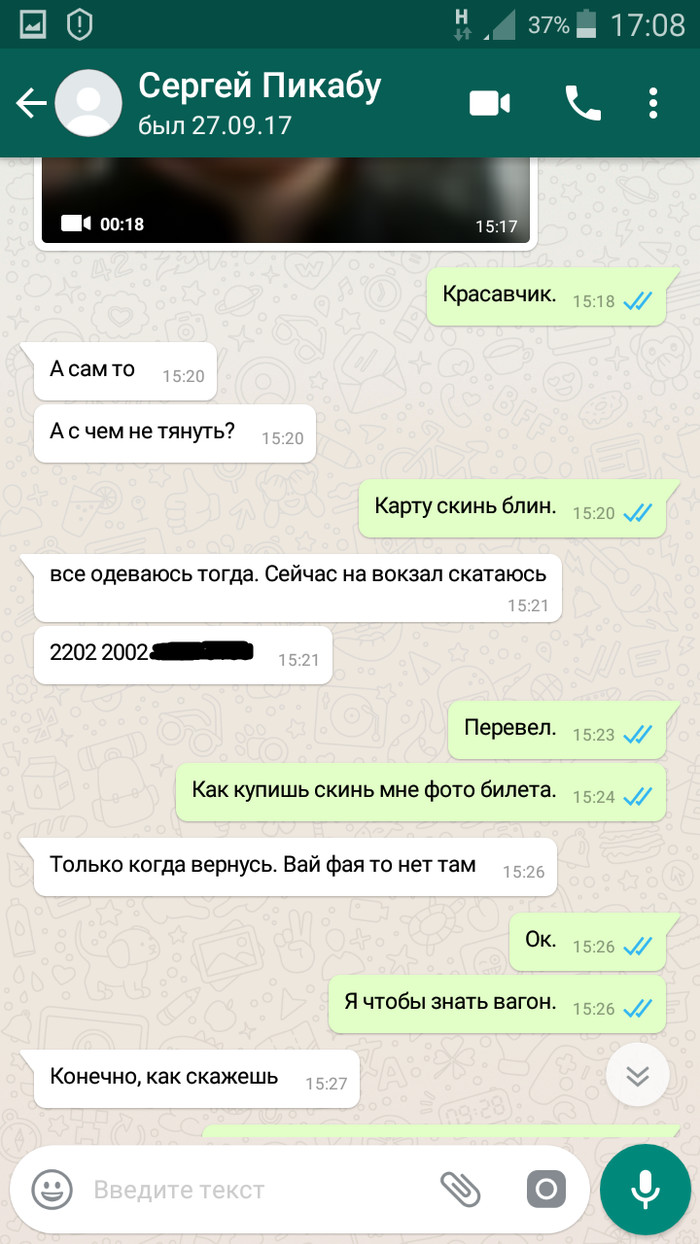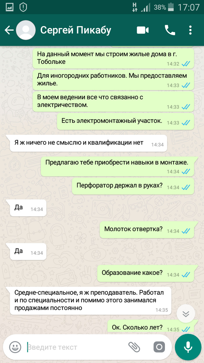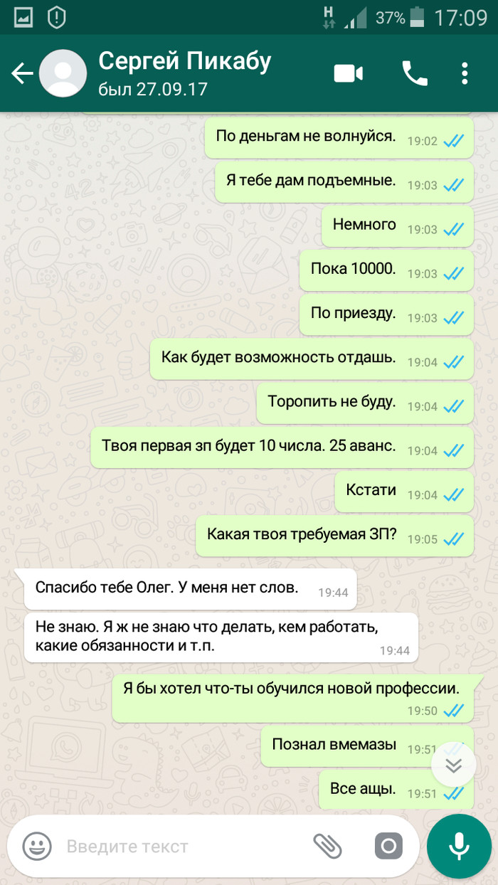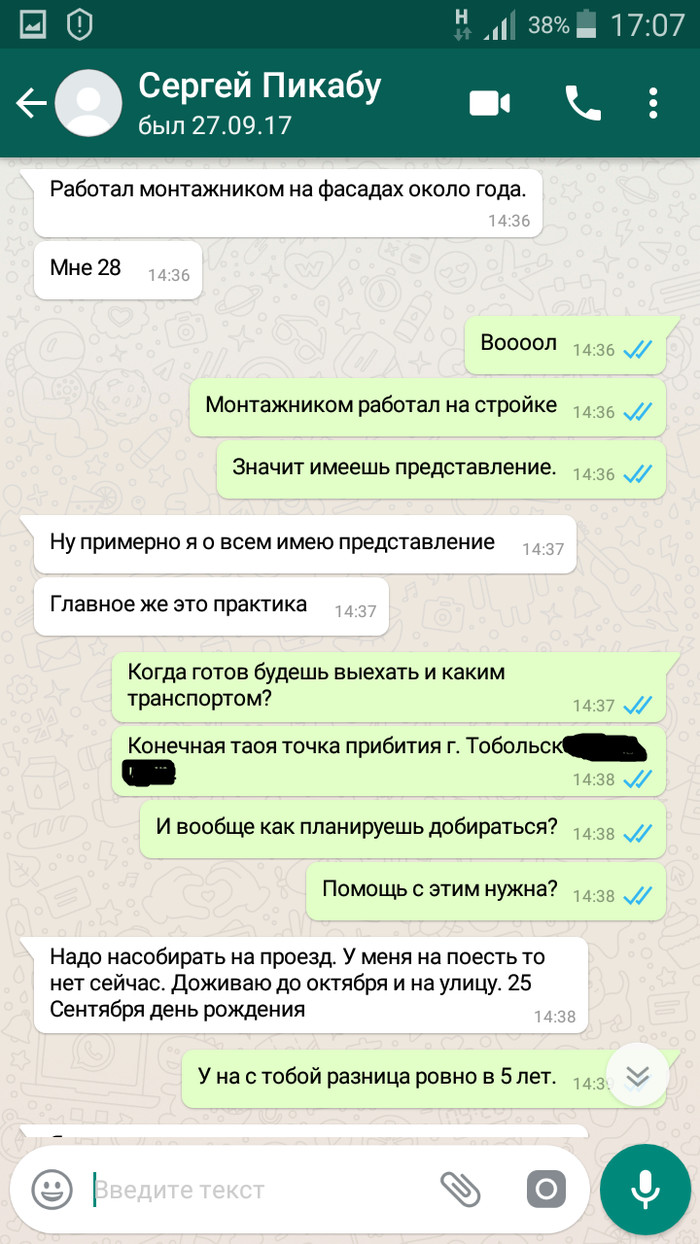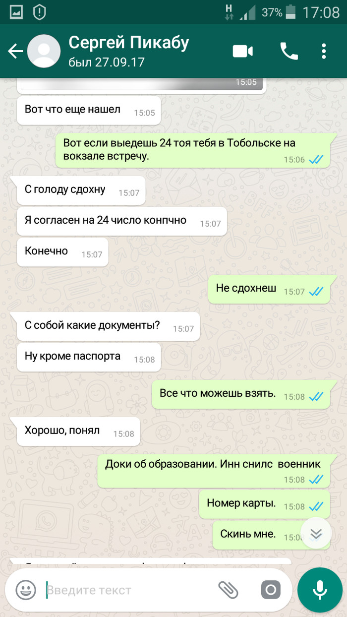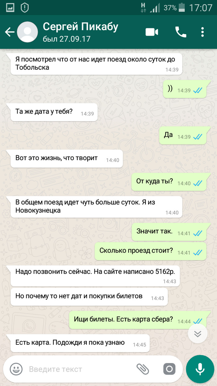 В тот же день мы с ним созвонились. Я ему еще раз предложил переехать в город Тобольск на работу. Жильем, рабочей одеждой, деньгами я его обеспечивал. ЗП не большая, но для человека который никогда не занимался такими работами вполне достойная. Он согласился и начали искать билеты на ЖД. На подходящую дату билет стоил что-то в районе 4500р. Денег у него не было. Далее я приведу нашу переписку в месенджере.