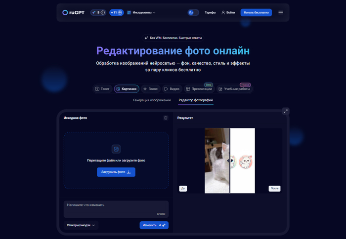Бесплатный доступ и бонусы — три запроса без регистрации и стартовый бонус (~20 запросов) после создания аккаунта.