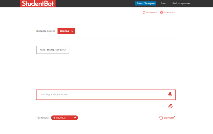 Простой интерфейс — минималистичный чат с мгновенными ответами и удобной навигацией между режимами.