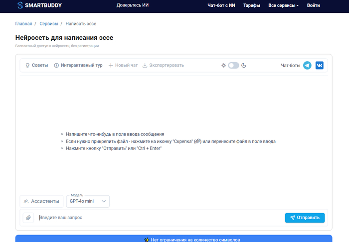 Без ограничений по символам — можно отправлять длинные тексты и получать развёрнутые ответы от ИИ.