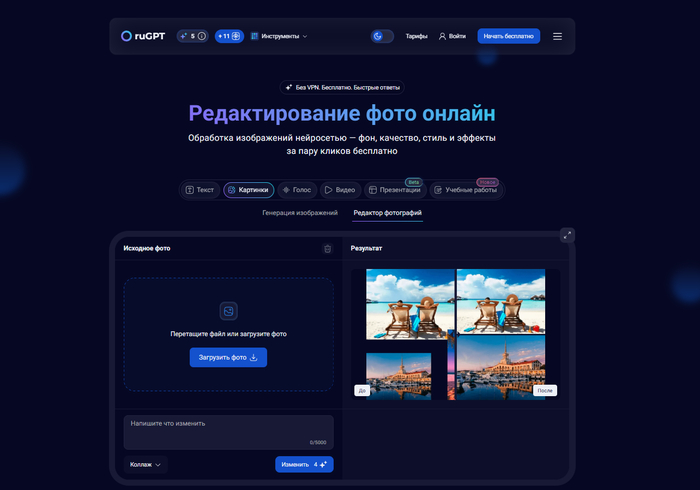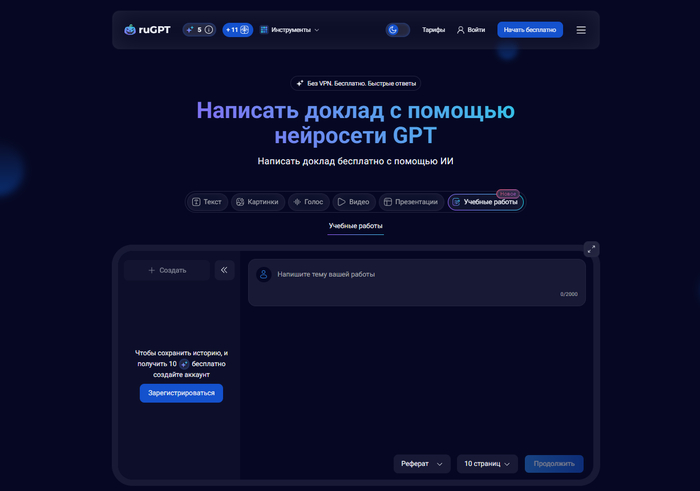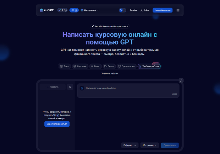 ruGPT io — это универсальный агрегатор нейросетей, объединяющий десятки современных моделей искусственного интеллекта (GPT-5, Claude, Grok, Gemini, DeepSeek и другие) для генерации текстов, изображений, озвучки и анализа данных. Платформа создана для студентов, преподавателей и авторов, которым нужно быстро написать эссе, реферат, курсовую или любую учебную работу без VPN и регистрации. ruGPT полностью адаптирован под русский язык и работает прямо в браузере, предлагая интуитивный интерфейс и мгновенные результаты.
