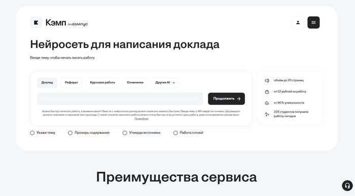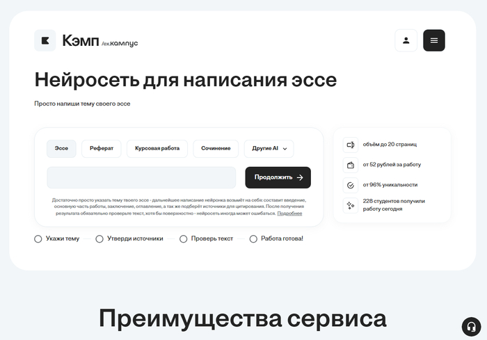 Кэмп (ex. Кампус) — это образовательная платформа нового поколения с искусственным интеллектом, которая помогает студентам учиться быстрее, проще и эффективнее. Нейросеть создаёт эссе, рефераты, курсовые, презентации и решает задачи по 160+ предметам, используя актуальные источники и оформление по ГОСТу. Кэмп сочетает в себе технологии GPT, учебную базу вузов и систему пояснений, благодаря чему студенты получают не просто готовый текст, а понятный результат с логикой и объяснениями. Платформа полностью адаптирована под российские вузы, работает онлайн и в Telegram, обеспечивает анонимность и помогает освоить материал в комфортном ритме.