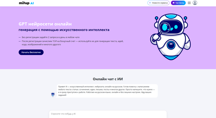 MitupAI — это онлайн-агрегатор нейросетей, объединяющий популярные модели искусственного интеллекта (ChatGPT, DeepSeek, Gemini, Grok, GigaChat, YandexGPT и другие) в одном окне чата. Платформа позволяет генерировать тексты, изображения, код, идеи и отзывы без VPN и сложных настроек. Пользователи могут бесплатно задать два запроса в день, а после регистрации получить бонусный баланс для тестирования расширенных функций. MitupAI работает полностью на русском языке, поддерживает загрузку файлов, хранение истории и интеграцию через API, что делает его удобным инструментом для студентов, копирайтеров, предпринимателей и специалистов по контенту.