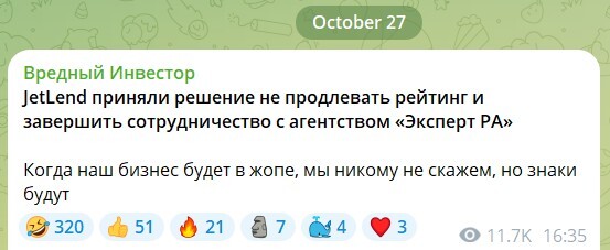 🐌 Краудлендинговая компания JetLend приняла решение не продлевать свой кредитный рейтинг и завершить сотрудничество с агентством «Эксперт РА». Как говорится – зачем платить за рейтинг, если он, похоже, стрёмным получается? =)