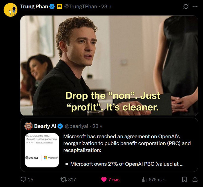 🐌 OpenAI [кажется] завершили свою реструктуризацию, о которой мы писали еще давно. Теперь есть коммерческая «public benefit corporation» OpenAI Group и некоммерческая OpenAI Foundation. Доля Microsoft в новой коммерческой компании составит 27%, у некоммерческой OpenAI Foundation 26%, оставшиеся 47% попилены между остальными инвесторами и сотрудниками. При этом у OpenAI Foundation, вроде как, должен остаться основной контроль за новой коммерческой компанией (право снимать и назначать членов совета директоров, как минимум).