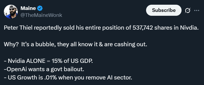 🐌 Фонд Питера Тиля (сооснователь PayPal/Palantir) продал всю свою долю в NVIDIA стоимостью в $100 млн. А еще чуть раньше Нвидию продал Softbank, как вы помните… Эти ребята чё, что-то знают??
