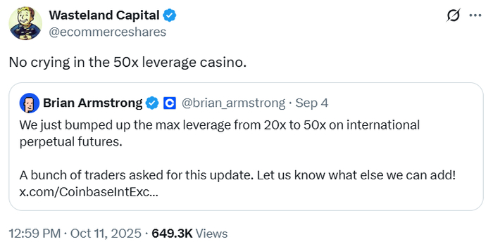Завершить этот блок хочется вот этим твитом. В сентябре: глава криптобиржи Coinbase пишет «по настойчивым просьбам трейдеров мы повысили лимит плеча до 50х…». 11 октября: «Плакать в казино с плечом 50х запрещено!».