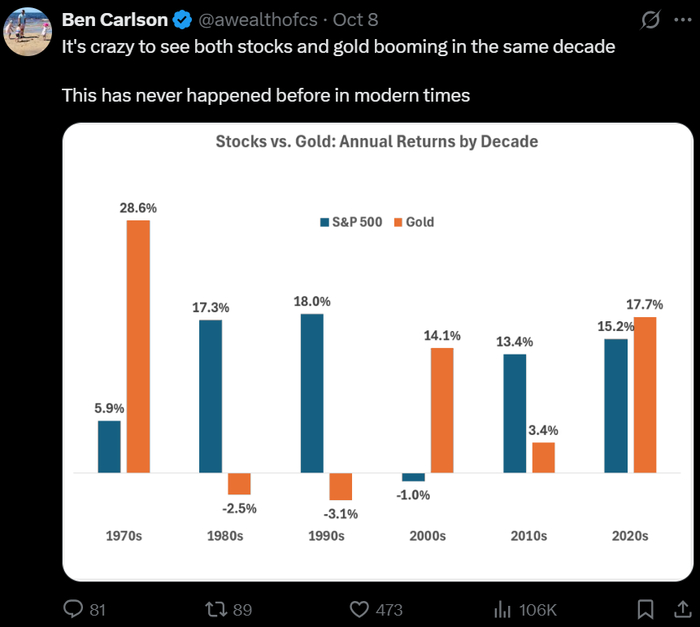 🐌 Цена золота впервые в истории пробила $4 тыс. В финтвите обратили внимание на то, что 2020-е – это первая декада, когда мощный рывок вверх показывают одновременно и акции, и золото (обычно их динамика была скорее разнонаправленной, если считать от среднеисторического уровня доходностей).