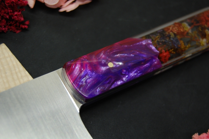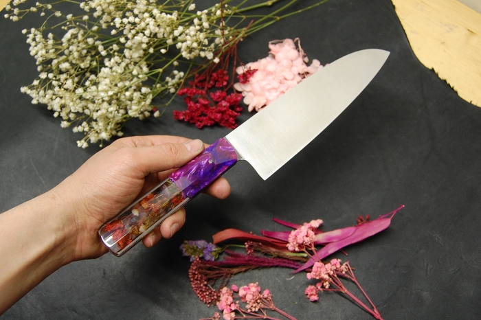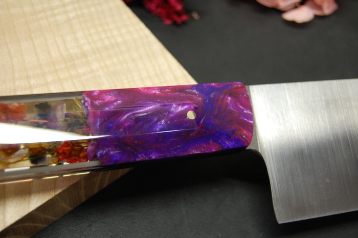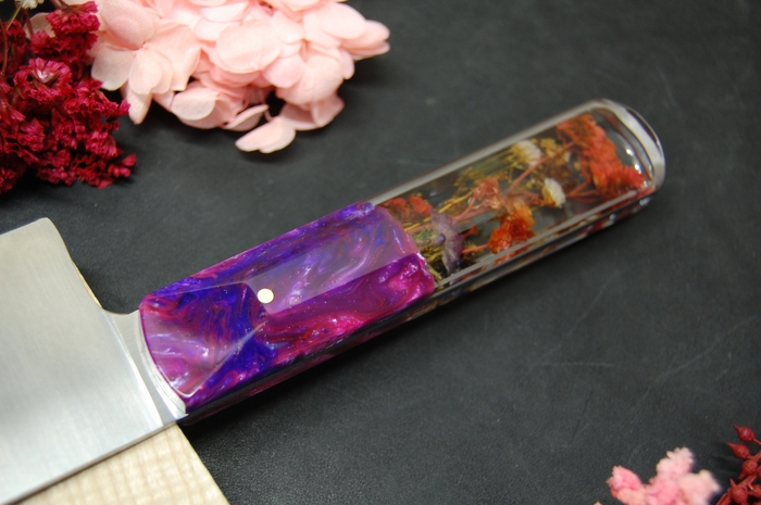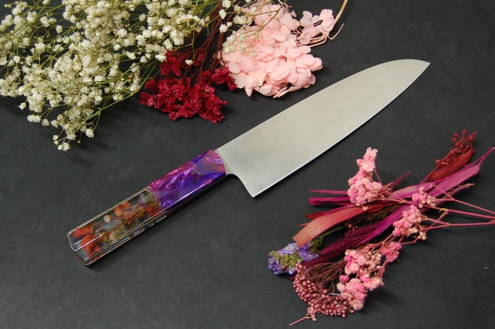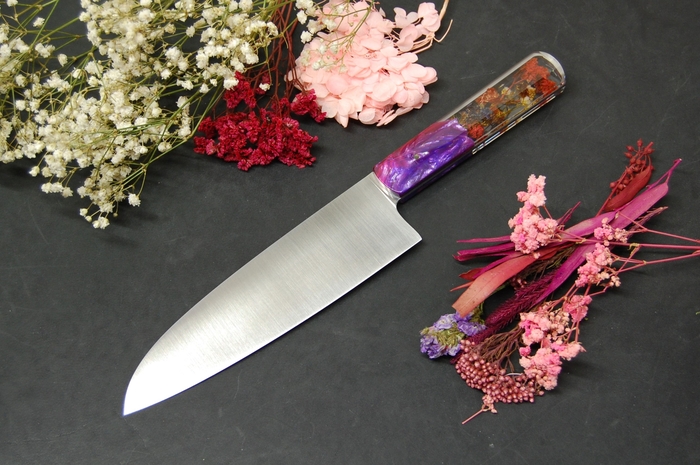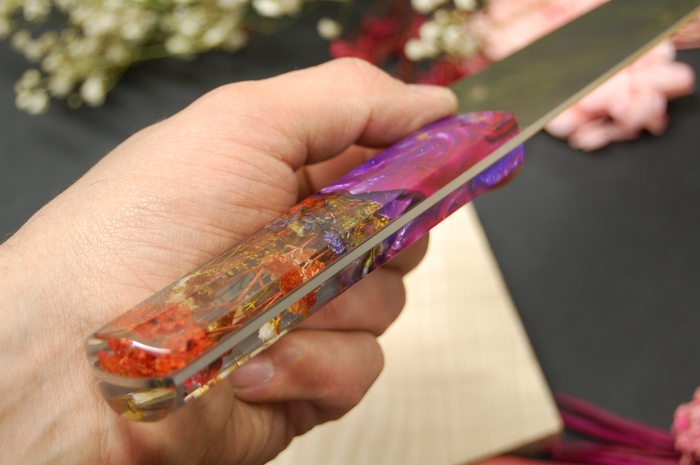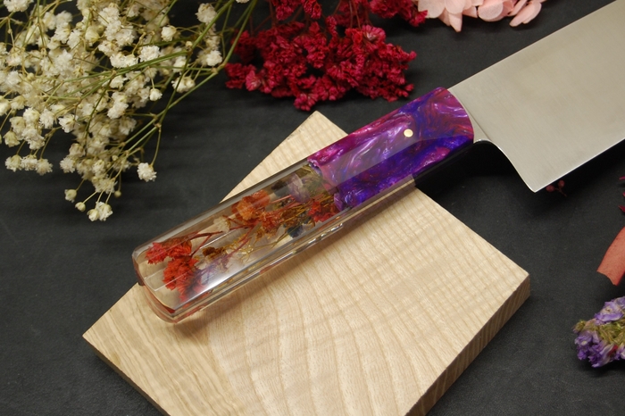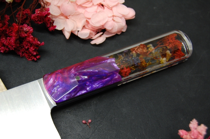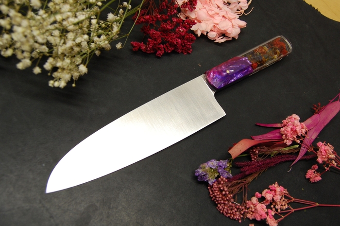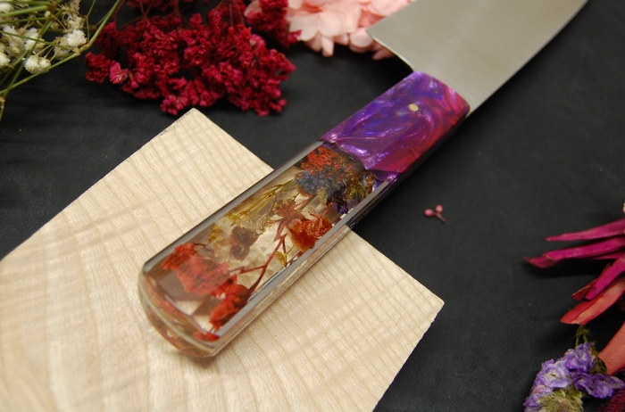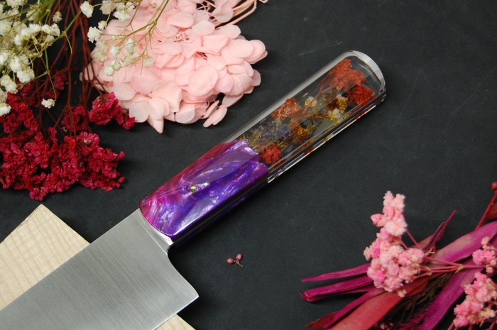 Об одном сложном ноже расскажу сегодня. Это сантоку на японский мотив. С восьмигранной рукоятью из акрила и сухих цветов.