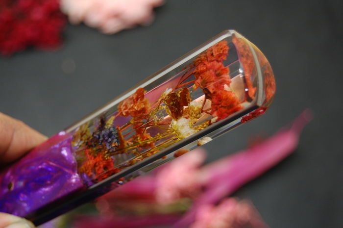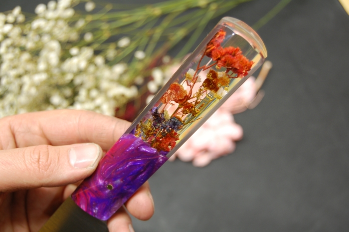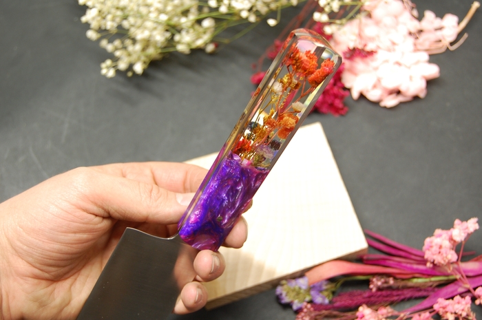 Именно такая конструкция обеспечивает необходимую прочность рукояти. А система "хоронения" даёт ей долговечности. Так как на кухне всегда вода и процессы намокания высыхания, то многие материалы долго не живут. Акрил к воде нейтрален, поэтому сухие цветы надёжно защищены под его слоем.