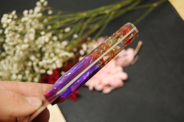 В хвостовике сделан очень большой пропил - выборка стали по форме будущей рукояти. Получается рамка с шириной стенок мм 2. А накладки это комбинированный монтаж из цветного дымчатого акрила, в космической расцветке. Прозрачного акрила. И букетика сухих цветов. Сухие цветы не выходят на поверхность рукояти, т е. они покрыты монолитным слоем акрила.