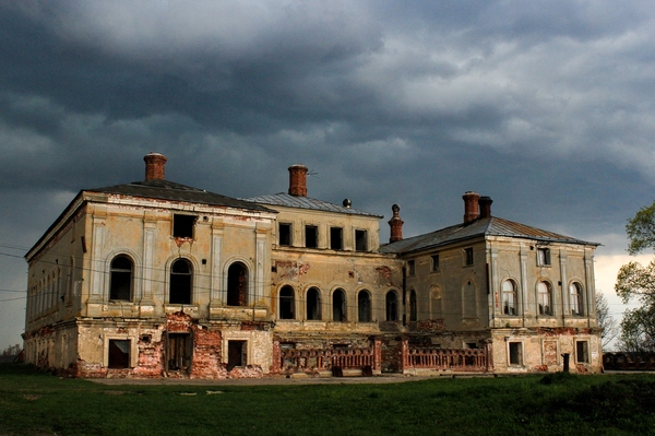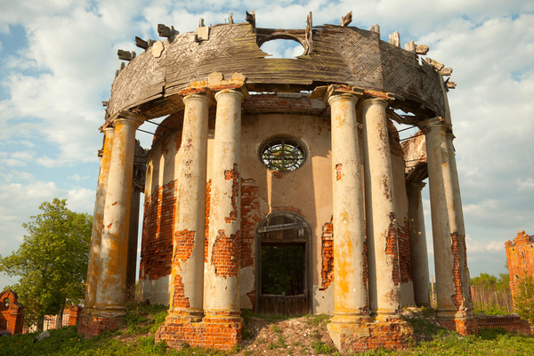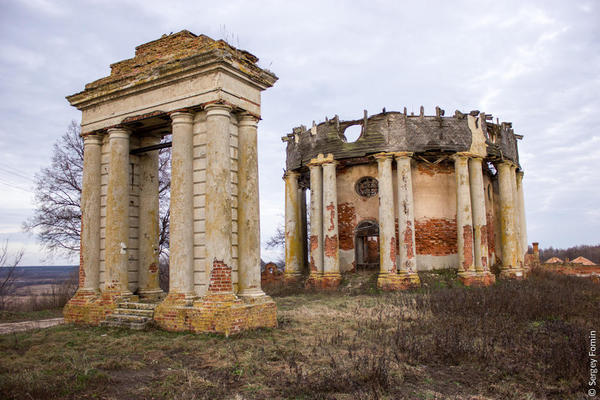 Подъезжая к усадьбе нас встречает импровизированная триумфальная арка и руины Воскресенской церкви