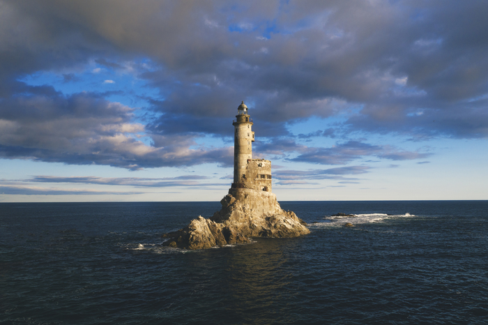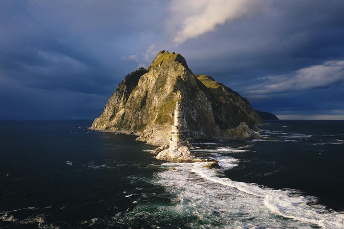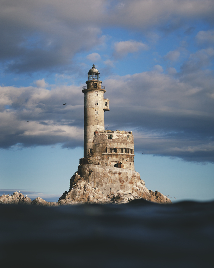 Один из самых красивых и атмосферных маяков в России, а то и в мире, застывший в лучах закатного солнца в гордом одиночестве, на фоне надвигающегося к нему шторма