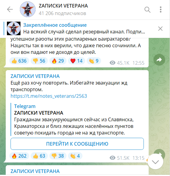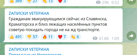 При этом опубликованные пророссийскими каналами отчеты (посты уже удаленны) о попадании по «скоплению ВСУ» вряд ли могут служить непосредственным признанием вины — по нашему опыту, подобные каналы часто репостят найденные в интернете кадры обстрелов жилых кварталов и выдают их за удары по украинским военным объектам. Куда более подозрительно выглядят предупреждения, опубликованные пророссийским каналом в ночь с 7 на 8 апреля, где жителям Славянска и Краматорска советуют не эвакуироваться железнодорожным транспортом. Кроме того, российское Минобороны само неоднократно сообщало (в т. ч. и сегодня) об ударах по железнодорожным станциям к западу от Краматорска. Буквально накануне представитель украинской железнодорожной компании «Укрзалізниця» Александр Камышин сообщал, что в результате удара по путепроводу в районе Барвенкова были задержаны три эвакуационных поезда.