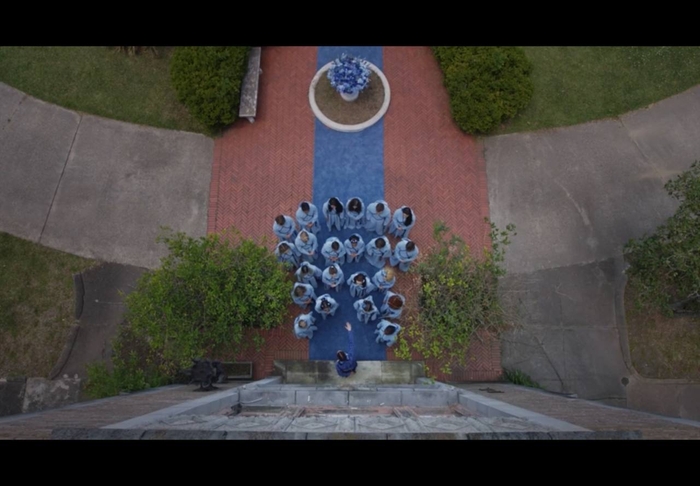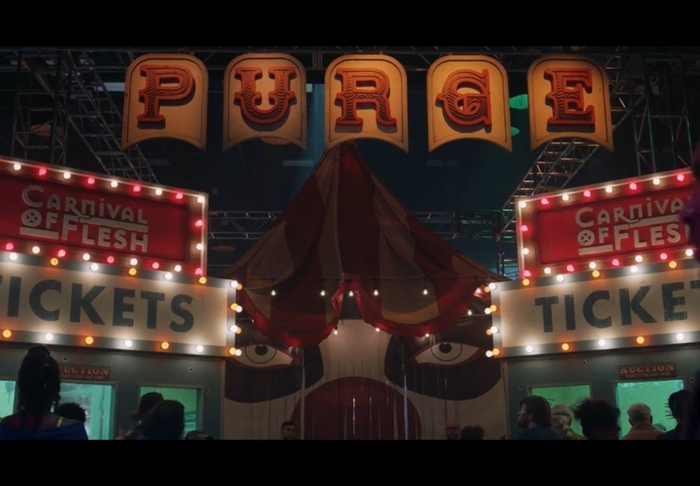 Сериал начинается с прослушивания на голос-оповещение. Мне нравится эта сцена из-за того, что на прослушивание приходит самая обычная женщина со своими мыслями и вопросами о персонаже. Сама женщина кажется милой и радушной до того момента, когда она входит в образ. Как только она начинает читать текст, то это производит невероятный эффект не только на жюри, но и на нас из-за контраста. Мы понимаем, что перед нами стоит та самая женщина, которая каждый год озвучивает правила Судной ночи.