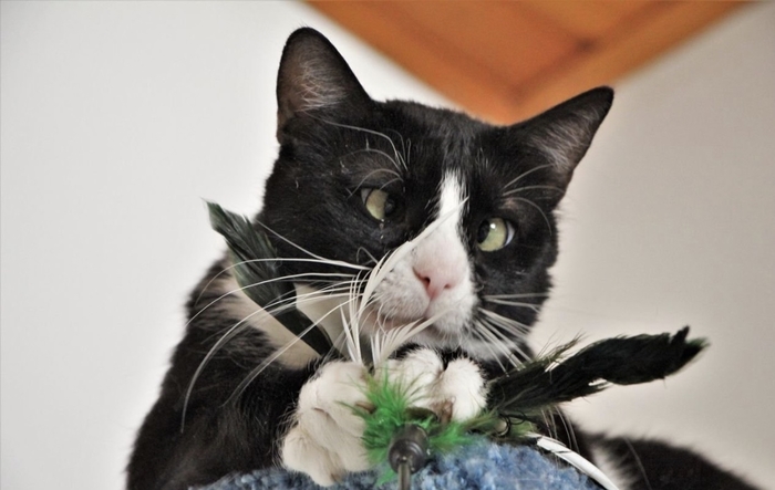 Знаете, кот твёрдо уверен, что зубья у него ого-го! Их фактическое отсутствие совершенно не мешает ему кусать руку при проведении приёма, известного как "Кровавый велосипед". Он постоянно таскает во рту свои игрушки. Мы с женой специально покупаем ему небольшие, чтобы мог унести, просто легонько сжав их в пасти.