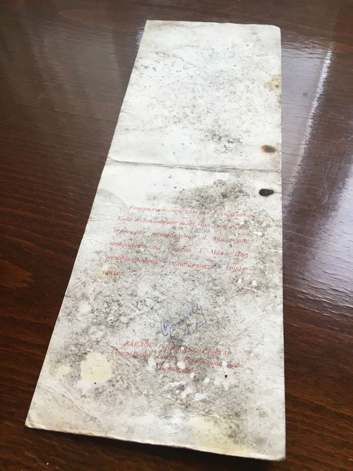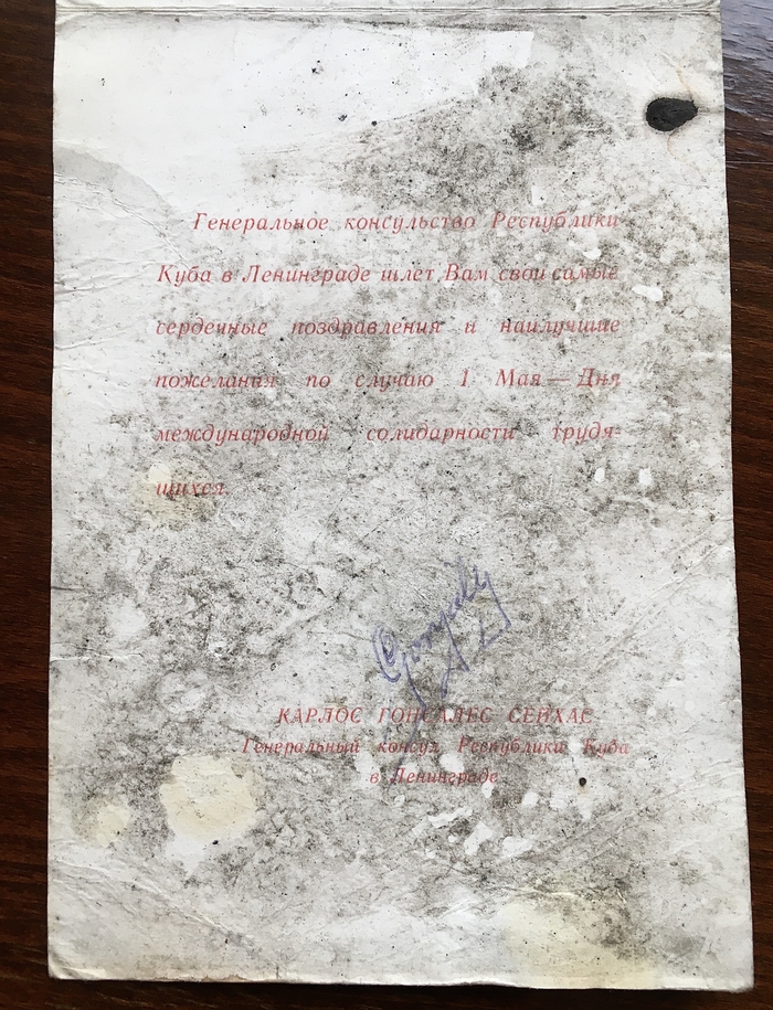 "Генеральное консульство Республики Куба в Ленинграде шлёт Вам свои сердечные поздравления и наилучшие пожелания по случаю 1 мая - Дня международной солидарности трудящихся.