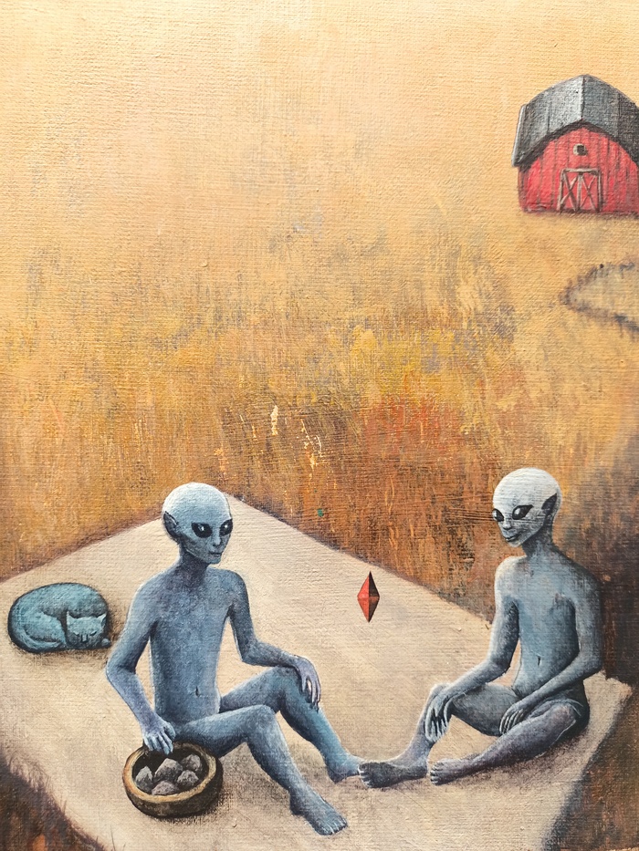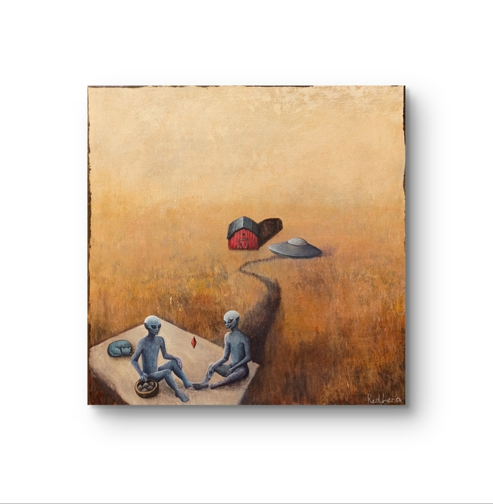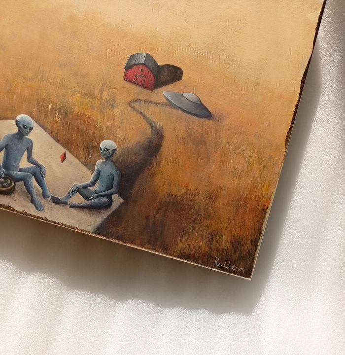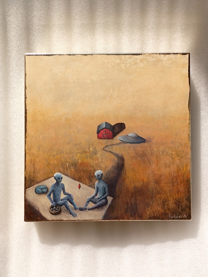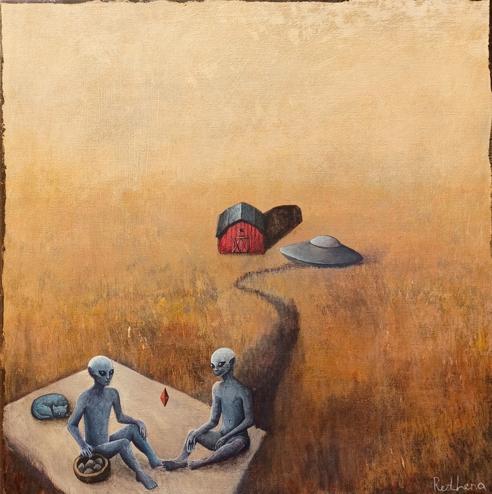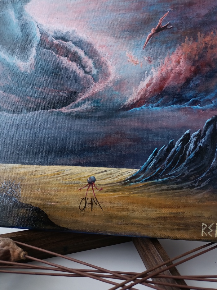 Картина в стиле фантастики, постапокалипсиса, выживания. Фэнтезийный пейзаж с существами. Картина из серии "ПроЭпиЛог". Картина авторская, концептуальная, сюжетная и в единственном экземпляре. На этой картине запечатлён мир, переживший катастрофу, где законы привычной реальности больше не действуют. Главный герой — перекати-поле, символизирующее беспомощность и вечный поиск. Оно перекатывается по пустынной равнине, отражая стремление найти свой путь в хаосе.