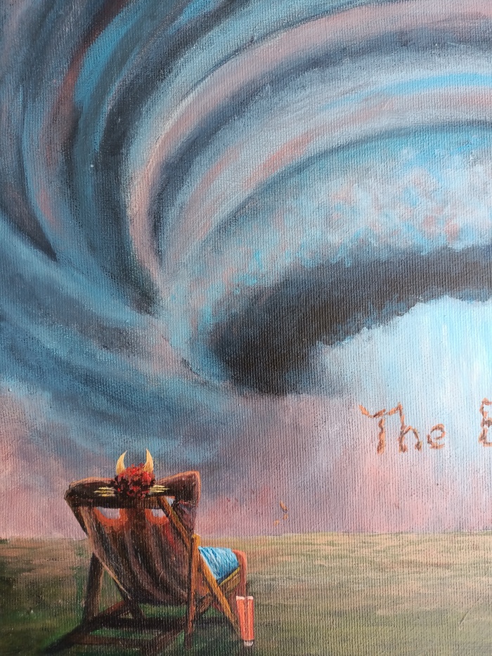 Грозовые облака, изогнутые в пугающую спираль, и странная летающая фигура вдалеке создают атмосферу тревоги и неизведанности. Скалы на горизонте словно обрамляют сцену, оставляя ощущение замкнутости этого странного мира.