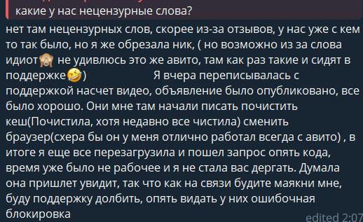 Каждый раз, когда мне прилетает заказ на продвижение компаний на Авито, всё начинается очень хорошо до момента публикации объявления. Это каждый раз какая-то война с техподдержкой. Мы даже заметили, что у поддержки есть 2 смены: неадекватная и адекватная. И если что-то идёт через одно место, надо попробовать через 12-16 часов, чтобы вышла новая смена и часто вопрос решается за 5 минут.