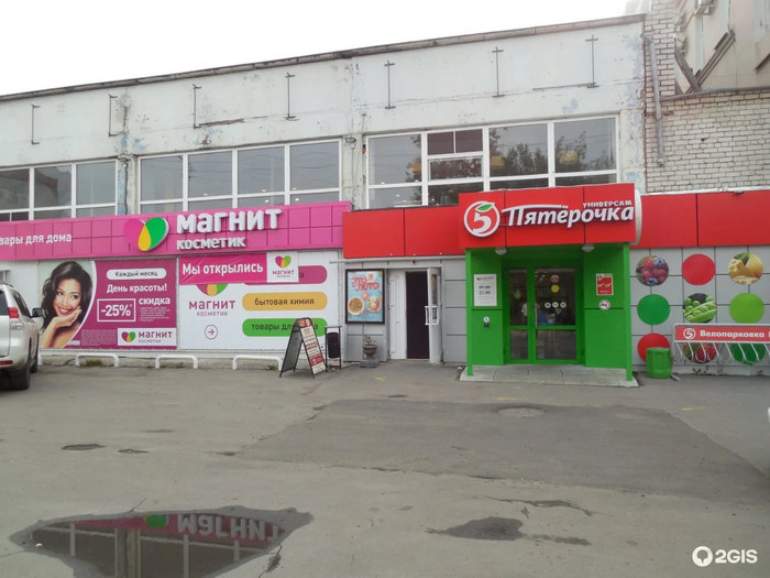 А Пятёрочка разместилась в здании, где модный цех по разделке мяса. Знаете, такой с прозрачными витринами, где вы можете наблюдать за тем, как обвальщики отрезают кусочки от туш и тут же в магазине при производстве продают свежее мясо: говядина, свинина, баранина и другое. Развлечение, сервис, свежесть, уникальные товары - всё в одном. А уже в Пятёрочке уже покупаются гарниры, чай, выпивка к основному блюду.