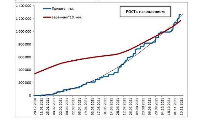 «Из представленных графиков можно сделать следующие выводы. Во-первых, общая тенденция в вакцинации („привито“) и заболеваемости COVID-19 („заражено“) носят идентичный характер, хотя повышение уровня вакцинации населения должно снижать уровень заболеваемости. Во-вторых, из графика прироста просматривается общая тенденция — с июля 2021 года увеличение уровня вакцинации населения вызывает синхронное увеличение заболеваемости», — резюмировал Александр Глушков.
