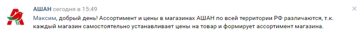 Сложилось так, что возле дома и работы (в одном городе) находится по торговому центру, в каждом из которых есть магазин Ашан, в которых я периодически затариваюсь. Никогда не обращал внимания на разницу цен в них, т.к. всегда думал, что раз уж крупная федеральная сеть, цены в них примерно одинаковые и устанавливаются на региональном уровне. Но не тут то было, купив в субботу и воскресенье один и тот же пакет продуктов (одних и тех же марок), в Ашанах, расположенных в разных ТЦ, разница в чеках оказалась примерно на уровне 40%...