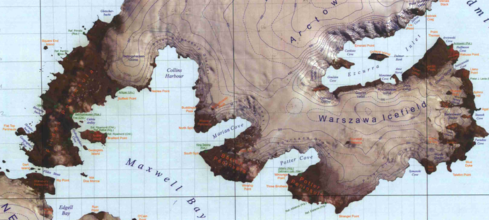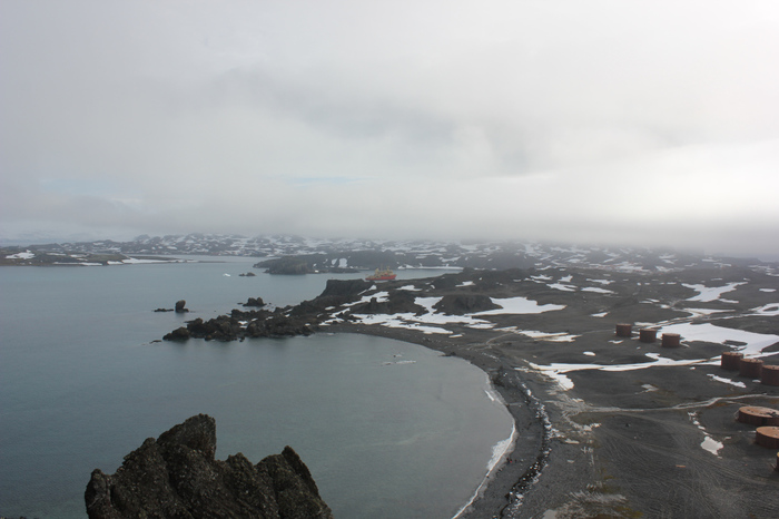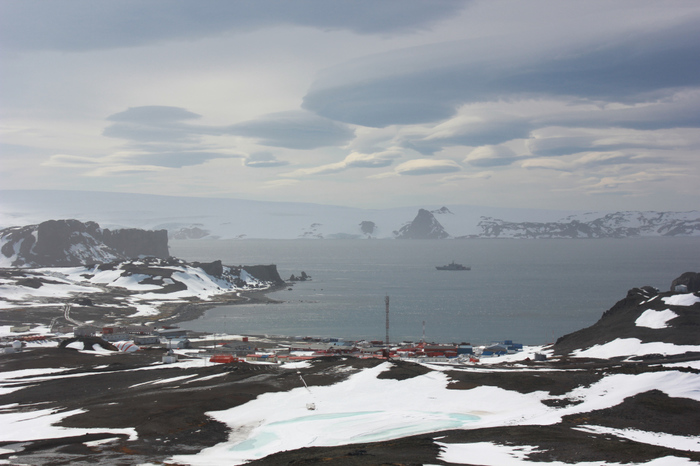 Наша станция расположена на полуострове Файлдс острова Кинг-Джордж (англ.) или Ватерлоо (рус.). Если верить Википедии то это самый крупный остров Южных Шетландских островов и наверное одно из самых теплых мест относящихся к Антарктиде. Назван британским мореплавателем Эдвардом Брансфилдом в честь короля Великобритании и Ирландии Георга III. В Аргентине остров именуется как Исла-25-де-Майо (исп. Isla 25 de Mayo) в честь дня начала Майской революции. Протяженность острова с северо-запада на юго-восток 16 миль, а с северо-востока на юго-запад около 43 миль (примерно 30 на 78 километров). Практически весь остров покрыт многовековой ледниковой шапкой, достигающей местами 600м. И только на небольшой части острова в летнее время свободных ото льда и снега участках (оазисы) располагаются 9 станций принадлежащих Аргентине (Джубани), Бразилии (Команданте Феррас), Китаю (Чанчэн — Великая Стена), Польше (Генрик Арктовский), России (Беллинсгаузен), Уругваю (Генерал Артигас), Перу (Мачу-Пикчу), Чили (Президент Эдуардо Фрей) и Южной Корее (Король Сэджон). Российская, чилийская, китайская и уругвайская станции находятся в непосредственной близости друг от друга, корейская станция располагается на противоположной от нас стороне залива. Остальные станции расположены чуть дальше в следующей бухте, но то же более-менее скомпоновано.