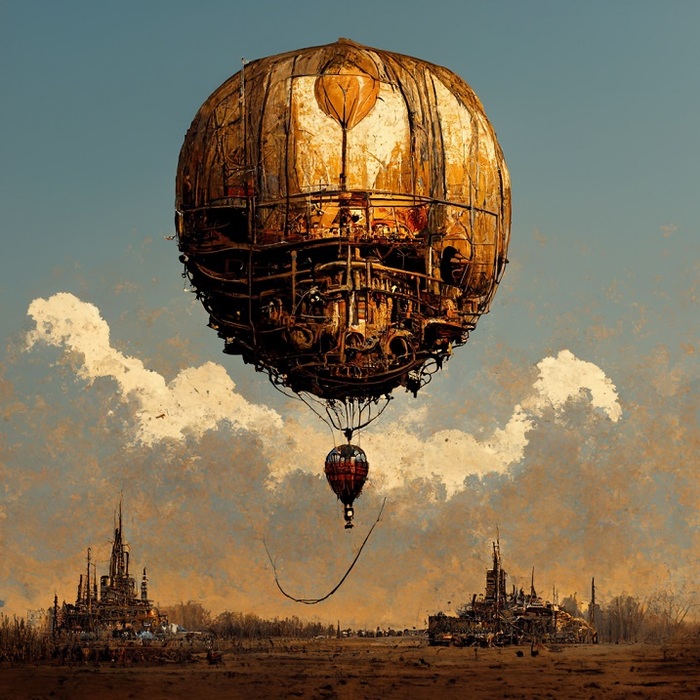 - Запрос "Воздушный шар, стимпанк". Нейросеть дорисовала замки и облака без моего запроса, но получилось очень даже органично.