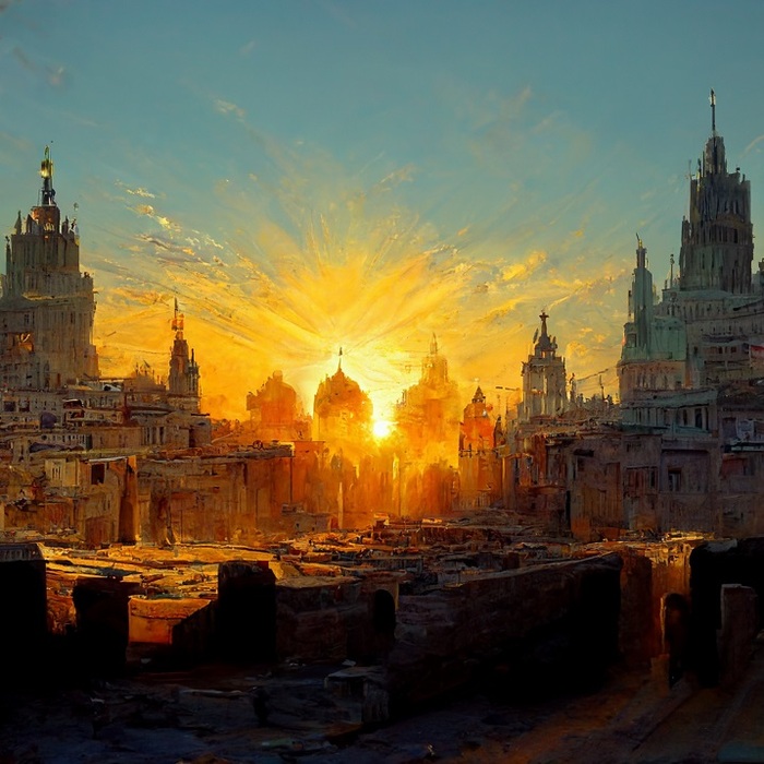 - Запрос "Древний город в лучах заходящего солнца". Залипательная картина, перенести на холст и повесить на стену))