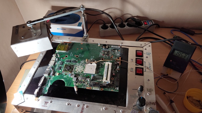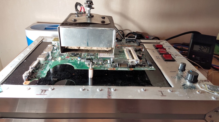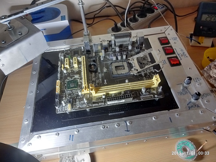 Станция моя, лучший образчик дендро-фекальной технологии. Кузов из задников матриц мониторов с дюралевыми углами, диммеры с али, башка 80х80 из сантехплитки и старой крышки матрицы ноута самсунг, все проложено минеральным картоном. Автоматику даже не думал ставить, паяю я не так много, могу и сам контролировать, главное подстроить нагрев по скорости диммерами один раз, сделать метки, где пайка, сушка, пиздец плате. Ну и можно пользоваться. Больше всего времени при постройке сего одоробла я убил на равномерность теплового пятна и низа и верха.