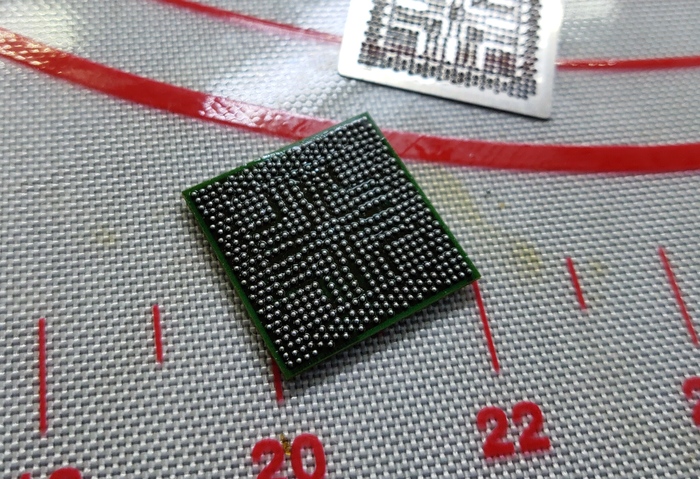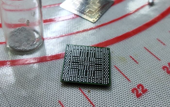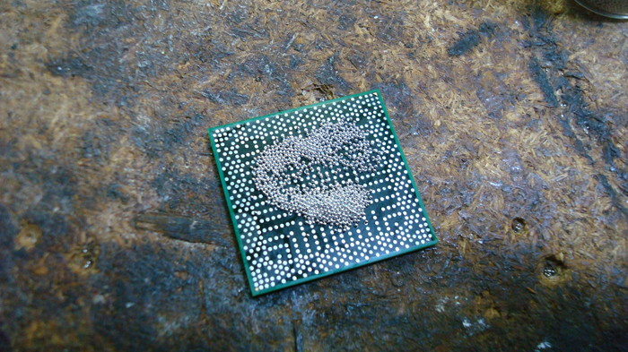 Дальше понизим температуру посадки чипа с 220 до 180 градусов. Для этого нужно заменить заводские безсвинцовые шары на свинцовосодержащие, просто перекатав шары.