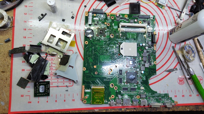 Готовим плату, разбираем, все рамки и пленки долой, снял охлад и понятно стало отчего он помер. Само собой и время ему пришло умирать из-за деградации пайки кристалла к подложке, а тут ему еще и помогли. Там не зря термопад с завода лежит, менять его на медь можно, но не нужно, а тем более на кривой кусок медяшки или люминяшки, вырезанный бабушкиными ножницами для кройки. Качество прижима видно, ага.