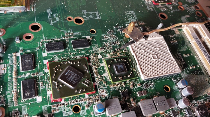 Ладно, снимаем север и чистим, готовим к установке нового. Да,да вакуумный пинцет по той же технологии сделан из аквариумного компрессора, спермоклея, капельницы, веток и прочего.