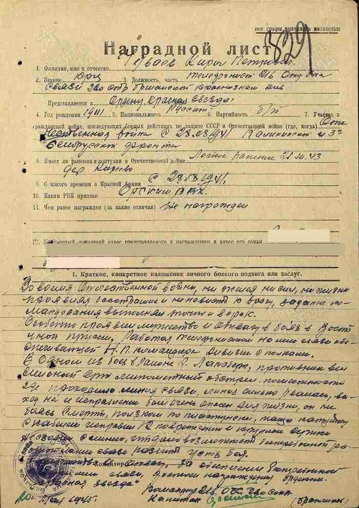 «Чуваев Кирилл Петрович родился в 1901 г. в Донской области. Во время гражданской войны с 1920 по 1924 гг. служил телефонистом на Кавказе. В 1941 г. призван на фронт из города Орска, Оренбургской (в то время Чкаловской) области. Служил телефонистом (связистом) в составе Центрального, 3-го Белорусского и 1-го Украинского фронтов. Был ранен, контужен, после госпиталя вернулся на фронт. Демобилизован в августе 1945. О войне рассказывал очень мало – слишком тяжелые воспоминания. Награжден Орденами Красной Звезды, Отечественной войны, медалью «За победу над Германией в Великой Отечественной войне 1941—1945 гг.», благодарностью от И.В. Сталина, юбилейными медалями.