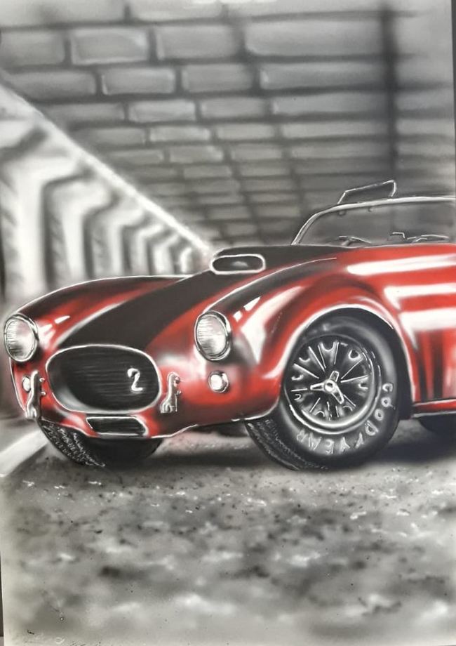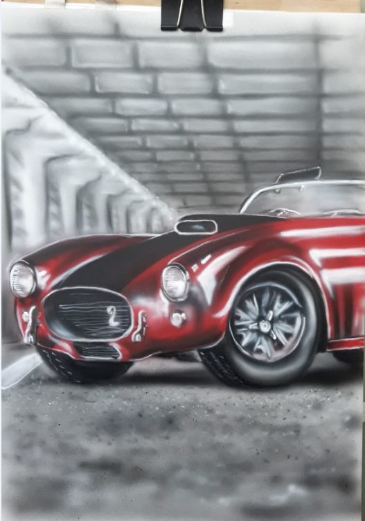 Попробовал нарисовать машинку я их правда почему то с детства не люблю рисовать, в третьем классе меня ругали за голых женщин нарисованых в тетрадке а вот машинки никак не шли. ну думаю пробовать то надо. Работа выполнена аэрографом и белой ручкой.