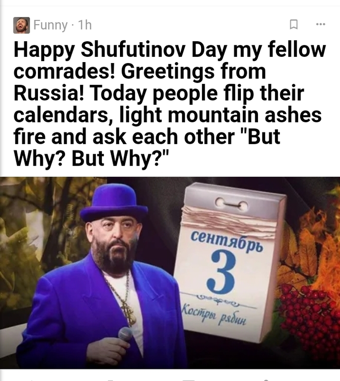 Перевод: "Поздравлем с Шуфутиновым Днем, друзья-товарищи! Привет из России! Сегодня люди переворачивают свои календари, когда горят костры рябин, и спрашивают друг друга: -Ну почему, ну почему?