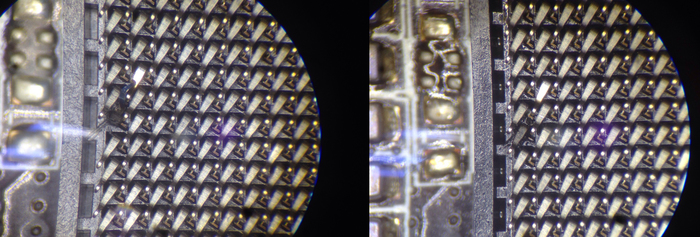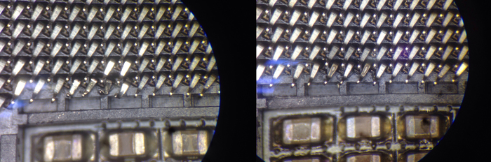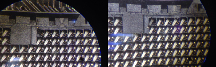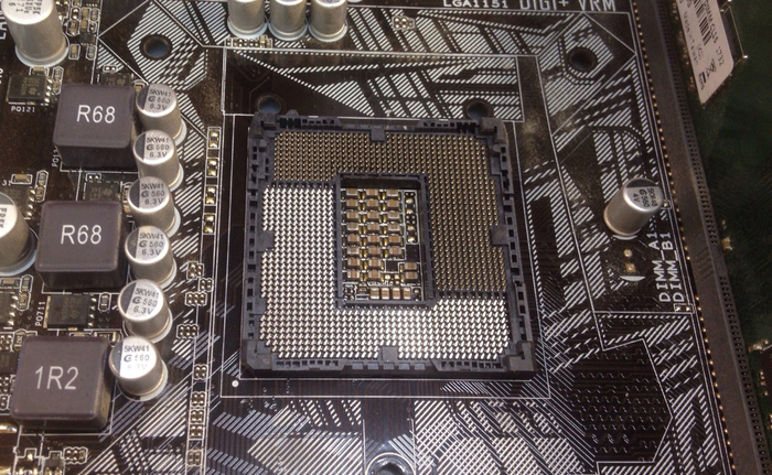 Но её сокет убит. И довольно сильно. Есть как повреждённые, так и подгоревшие ножки. Присутствуют отчётливые следы безуспешных попыток ремонта иголочкой на коленке.