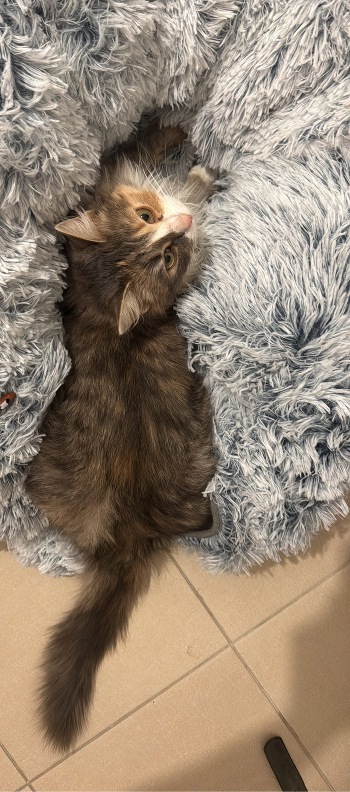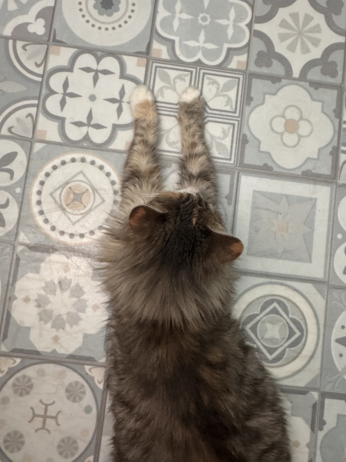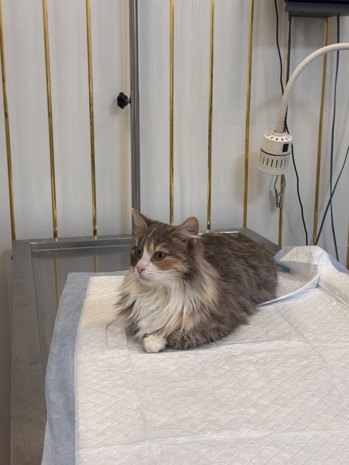 Временно взяли к себе, но надолго оставить не можем, у нас маленькая однушка и свой кот. Кошке приходится жить на карантине в коридоре. То что она домашняя, видно сразу: без ошибок распознала лоток, знает что такое сухой и мокрый корм.