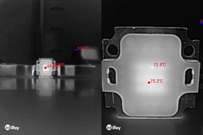 Смотреть будем на светодиодную лампочку без колпачка. И казалось бы вот, меньше разрешение, меньше деталей, всё сходится. Но несмотря на небольшую разницу в разрешении, детализация отличается очень сильно. Вот тут мы и подходим к более важному параметру, такому как NETD, который у HTI <70мК, а у Tooltop <50мК.